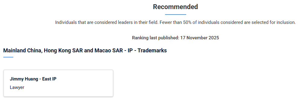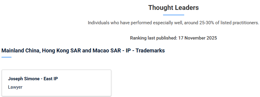 近日,国际知名法律评级机构Lexology Index,原(《法律界名人录》Who’ s Who Legal)发布2025年度中国内地、香港及澳门榜单。East IP联合主席、合伙人Joe Simone(谢西哲)律师凭借卓越的行业洞察与专业影响力荣膺“思想领袖”(Thought Leaders)称号;商标部负责人、合伙人黄静文(Jimmy Huang)律师获评为知识产权:商标领域“推荐律师”(Recommended Lawyer)。此次两位律师的卓越表现,充分彰显了East IP在知识产权领域深厚的专业积淀与行业领先地位。